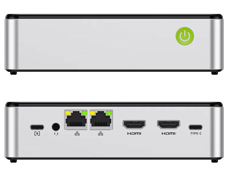 ▼前側面は電源ボタンのみ。後側面にはLANポートが2つ、HDMIポートが2つ、TypeCポートが2つ搭載。TypeCポートの片方は電源供給のみですが、もう片方はデータ転送、映像出力、PDに対応したフル機能のものになっています。↓
