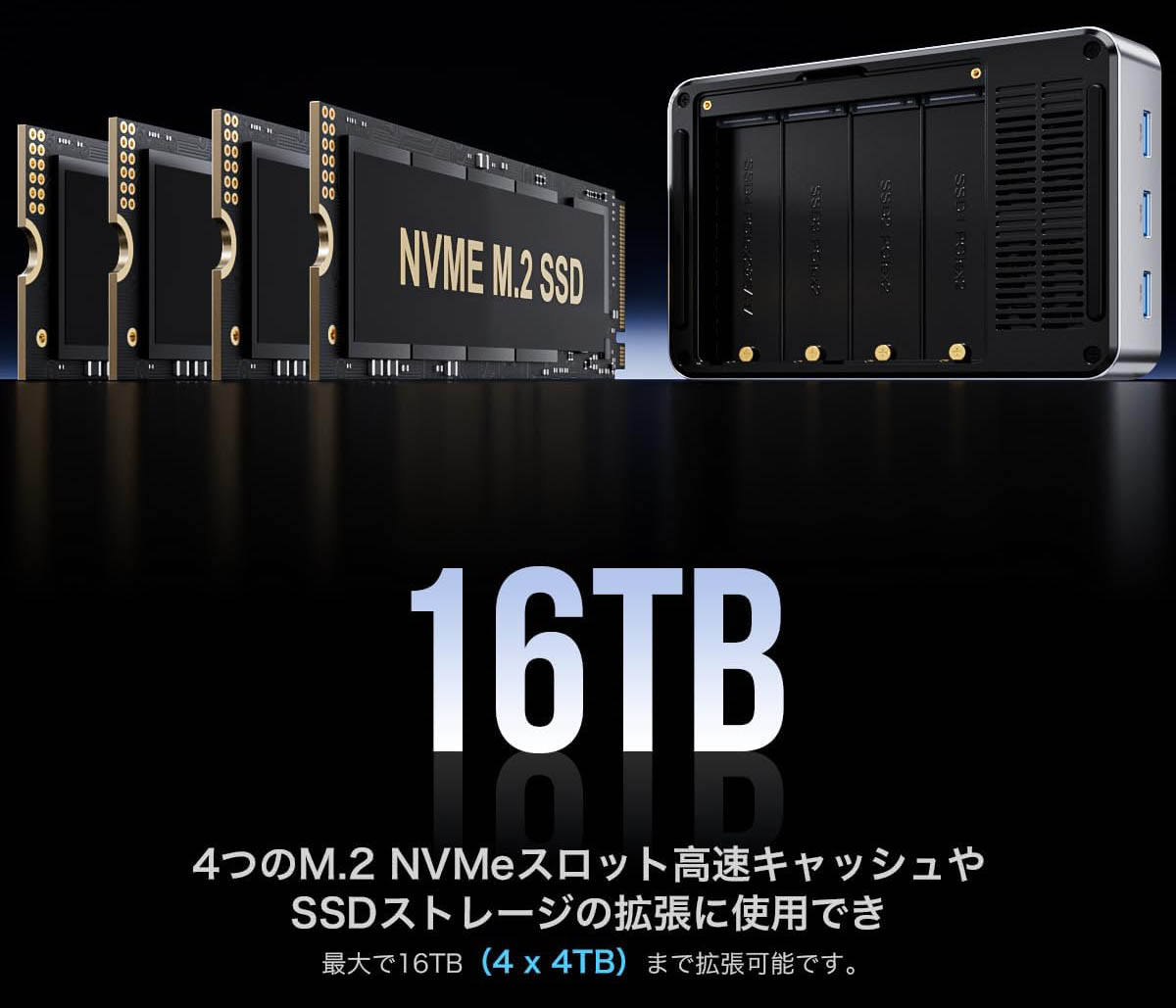 ▼本機の下部には4つのM.2スロットがあり、1つあたり最大4TB、合計で16TBのストレージを増設可能。↓