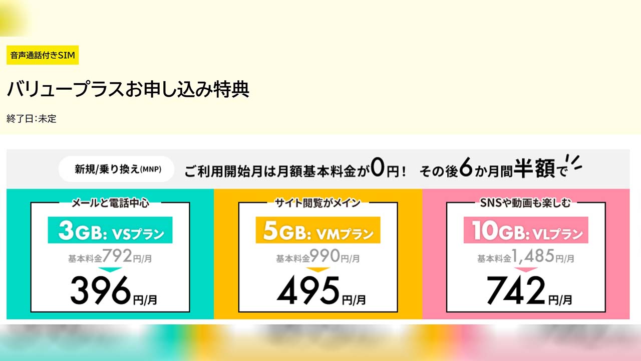 またキャンペーン期間内にバリュープラス内でプラン(データ容量)の変更をした場合、今のものより大きいプランであれば特典は引き続き継続されます。例えば期間内に3GB→5GBに変えた場合でも、5GBの半額料金495円で使えるというワケっす。