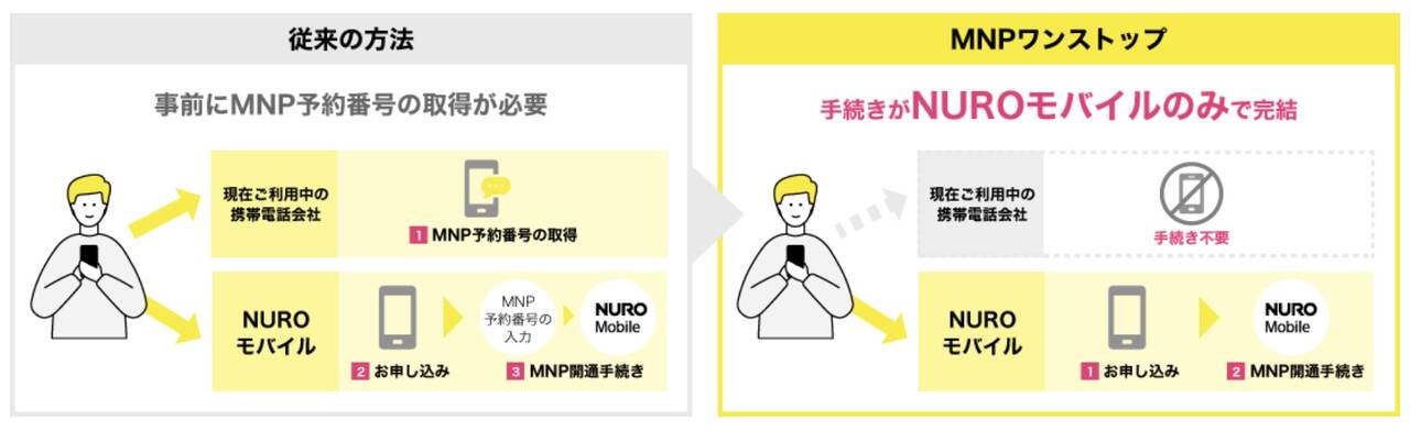 MNPワンストップ方式は、利用していた携帯電話会社での「MNP予約番号の取得」が無くなります。NUROモバイルに乗り換えたい!と思った瞬間に申し込めるのは楽ちんでGoodですね〜!
