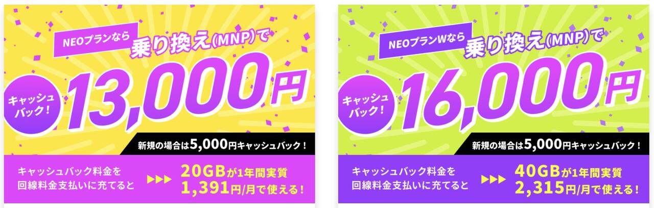 ▼そうそうNUROモバイルでは他社からの乗り換え(MNP)でNEOプラン(20GB)を選ぶと1.3万円、NEOプランWを選ぶと1.6万円のキャッシュバック中です!↓