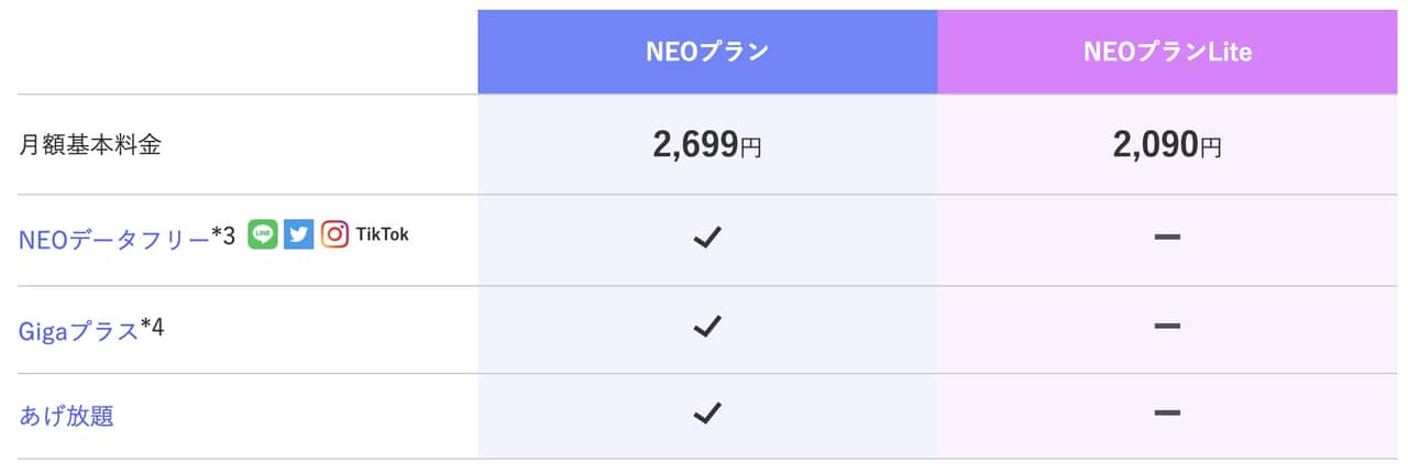 差額609円でこれらが利用できるなら個人的にはなかなか魅力的なんですが、必要・不要は人それぞれ。これらの付帯サービスは要らない!って人はNEOプランLiteにしましょう。