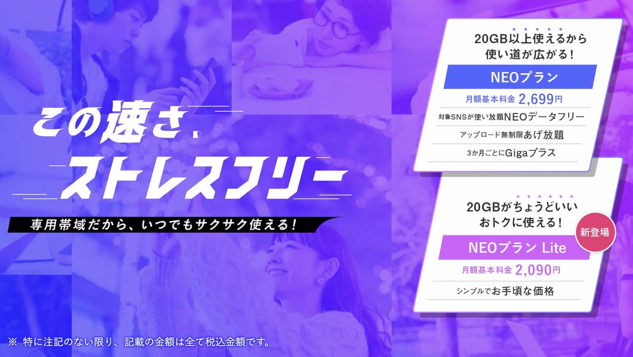 ちなみに初月は月額基本料金が無料です。すでに提供しているNEOプランが割と評判良いので乗り換えなどを検討されている方はチェックしてみて下さい!