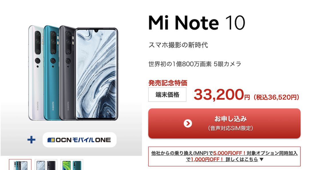 OCNモバイルONE|発売記念でXiaomi Mi Note 10が税別33,200円。