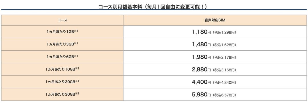 ▼OCNモバイルONEの利用料金は以下の通り。月間のデータ容量により月額が変わるタイプとなってます。↓