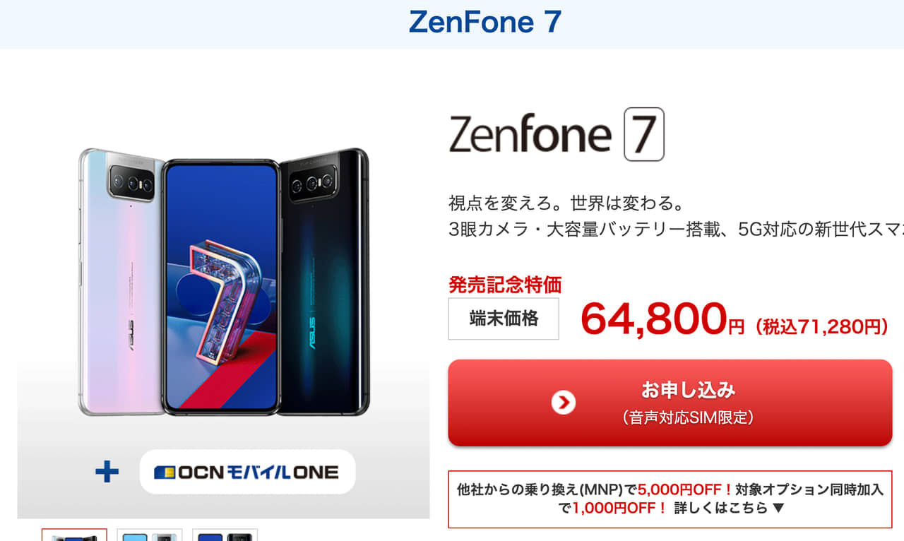 - ZenFone 7:64,800円(税込71,280円)