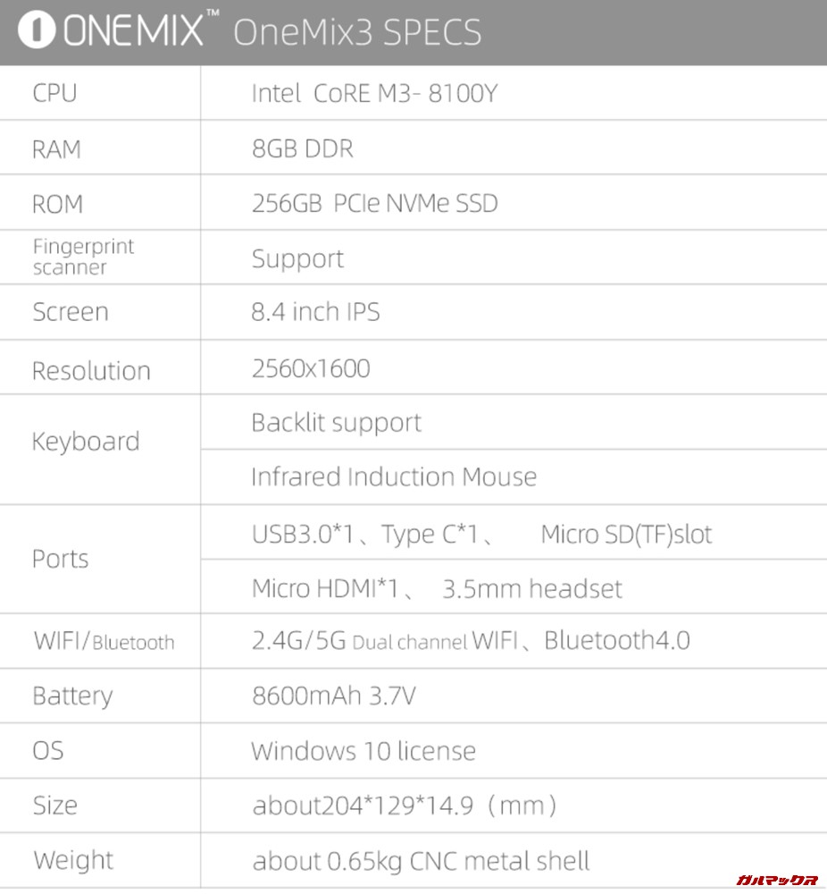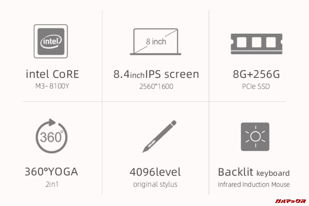 CPUはOne Mix 2Sにも採用されていたCore M3-8100Yを引き続き採用!