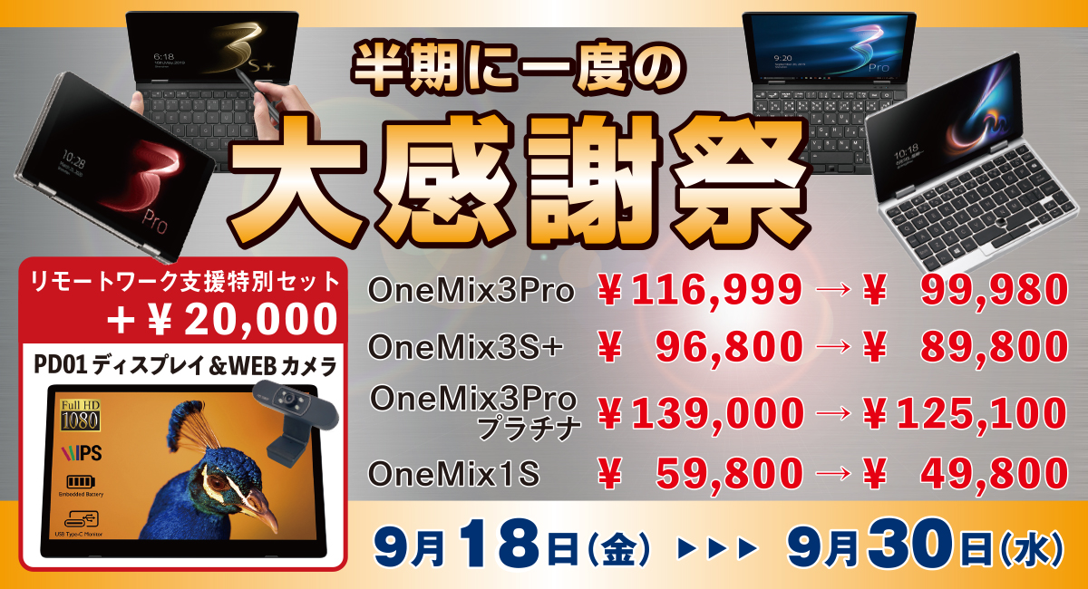 9月18日〜9月30日までの期間限定で開催中の「半期に一度の大感謝祭セール」は、同社の人気UMPC「OneMix」シリーズが対象で、4モデルが割引価格にて購入可能に!