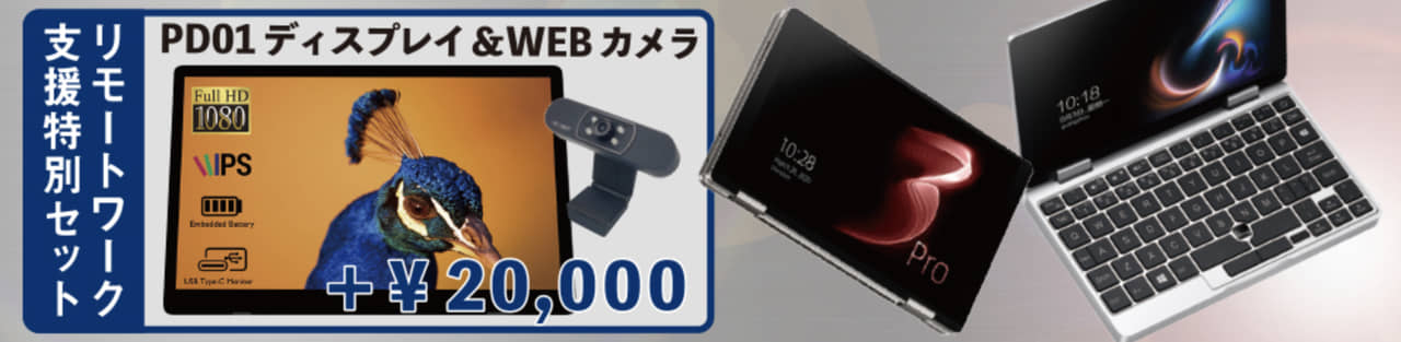 リモートワーク支援特別セットは、作業効率が劇的にアップするモバイルモニターと、鮮明な映像を捉えることができるWEBカメラのセットが20,000円で手に入るという内容です!