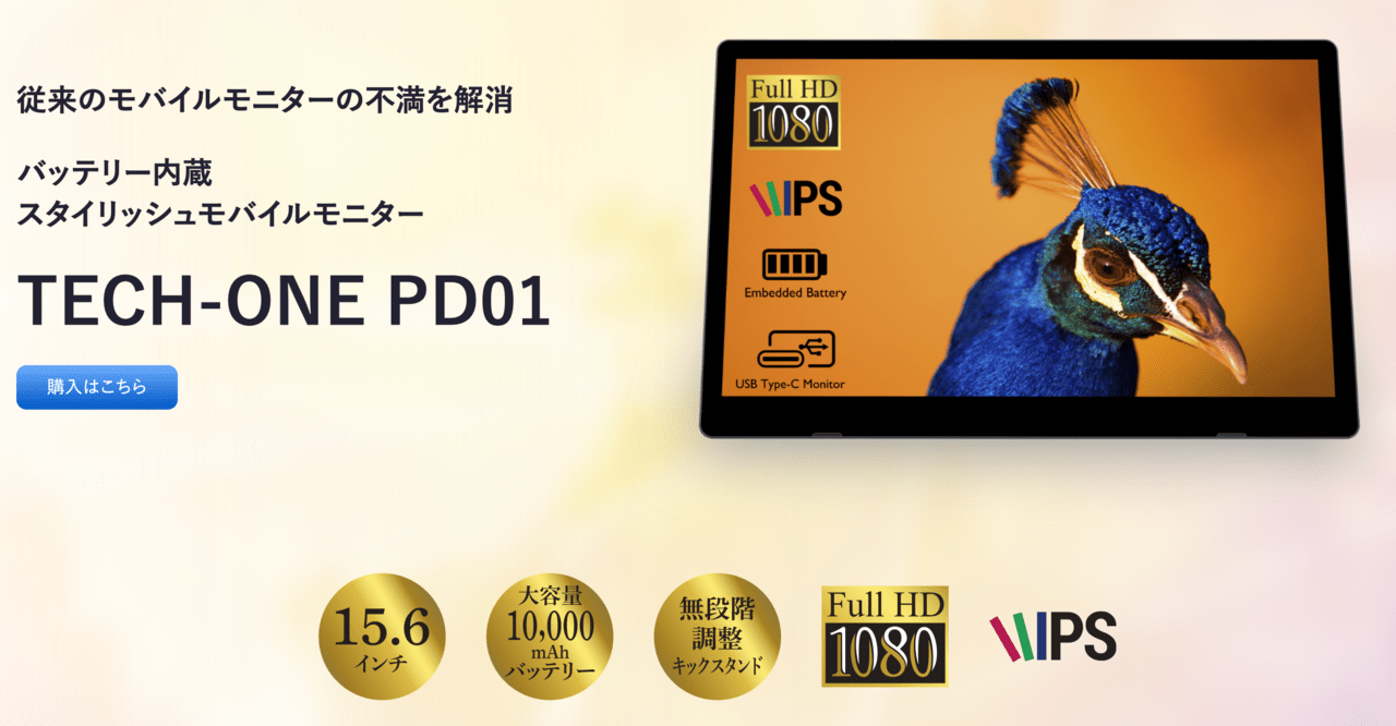 ▼セット購入で手に入るモバイルモニターは同社製で高い人気を博している「TECH-ONE PD01」。15.6型で視野角の広いIPSパネル、無段階調整のキックスタンド、そして、どこでも使えるバッテリー内蔵モデル!TECH-ONE PD01の通常価格は27,100円です!↓