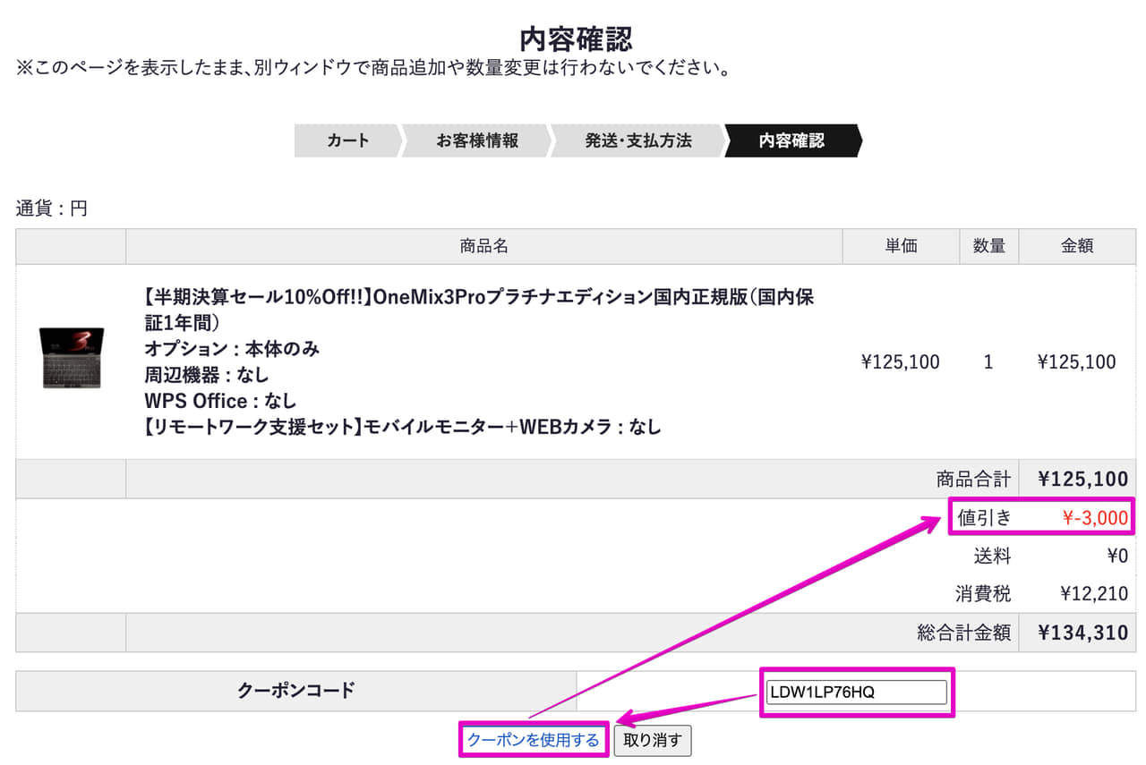 ▼割引クーポンは、製品をカートに入れてレジ画面に進み手続きを進め「内容確認」にてクーポンコードを入力します!入力後は「クーポンを使用する」を押して下さい!右側の値引き欄にクーポンの割引が表示されているはずです!↓