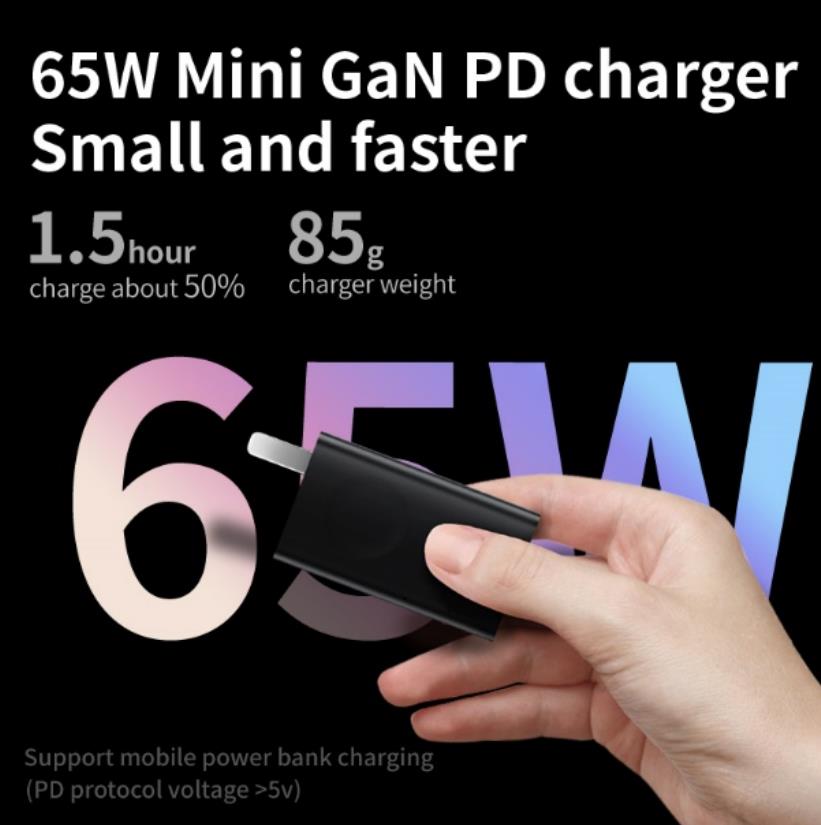 バッテリー容量は12,000mAh。公式によれば9時間もつとのことです。また65Wの急速充電にも対応しており、充電は2.5時間で済むんだそう!