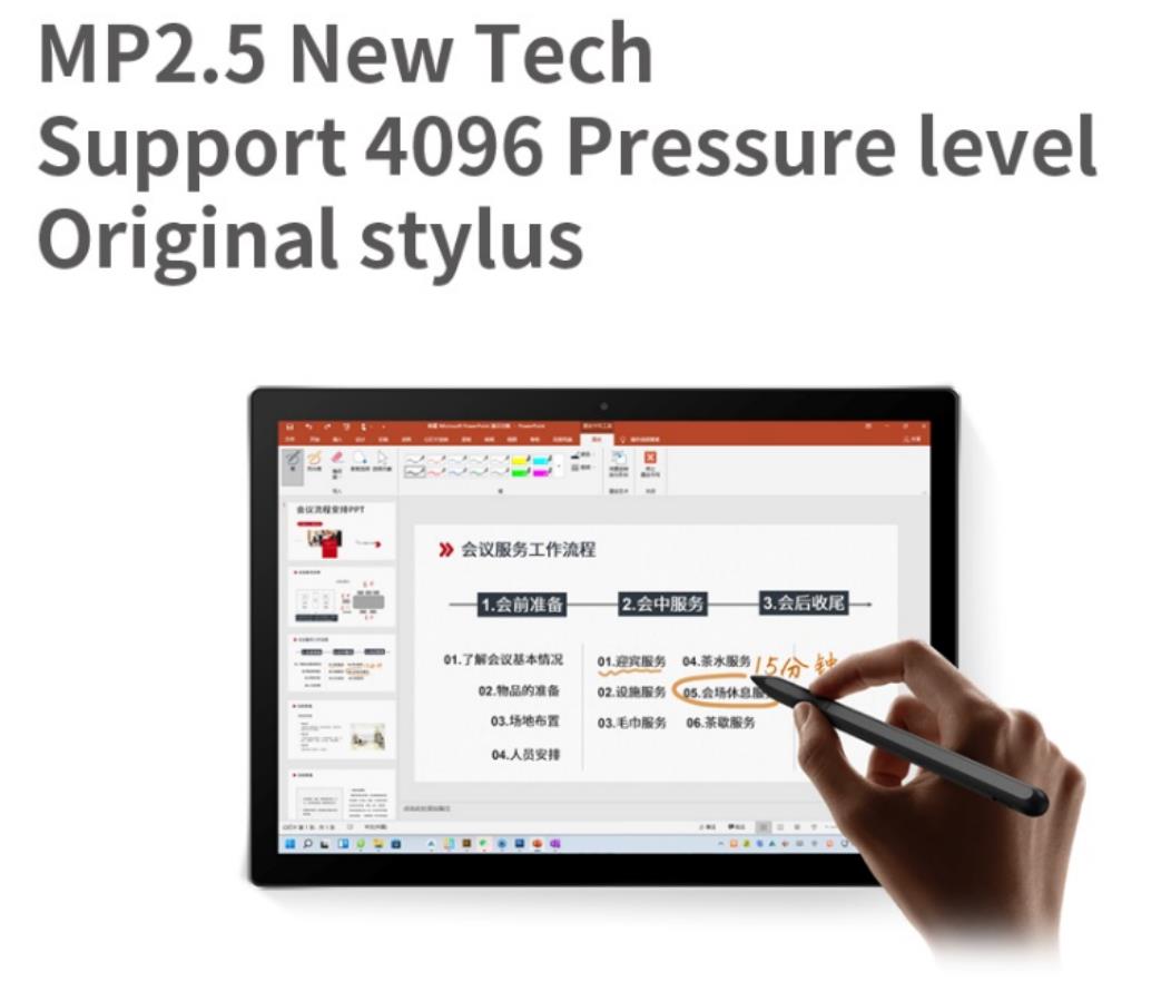 ▼別売りのスタイラスペンによる入力にも対応。4,096段階の筆圧に対応しているので、簡易的な書き込みやお絵描きにもOK!プレゼン資料作成時にも役立ちそう!↓