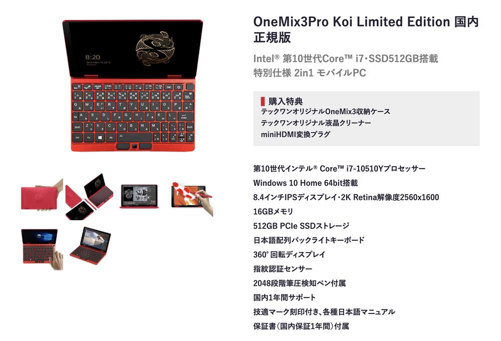 OneMix 3 Pro Koi Limited Editionの日本モデルなんですけど、2048段階のスタイラスペンが付属しています!また、正規代理店経由での購入だと【テックワンオリジナルOneMix3収納ケース】【テックワンオリジナル液晶クリーナー】【miniHDMI変換プラグ】が購入特典としてもらえるみたい!