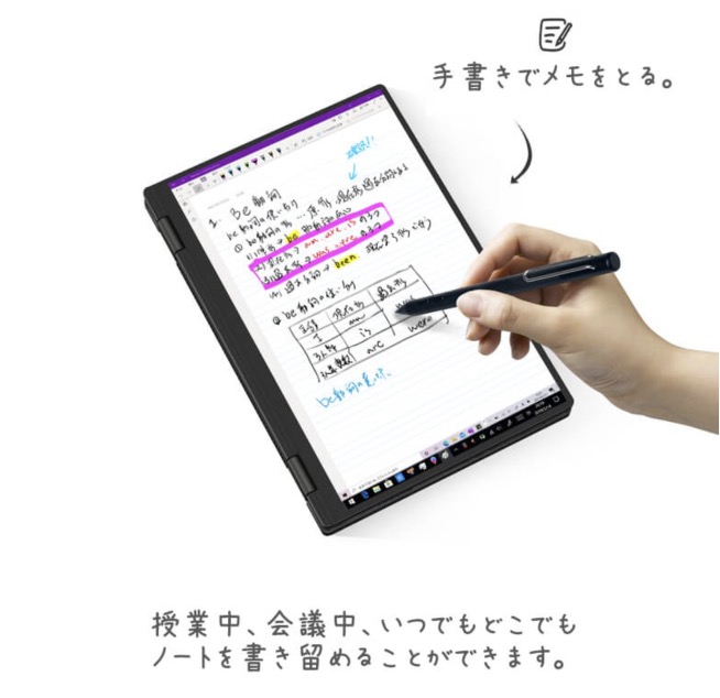 ▼もちろんスタイラスペンにも対応。2048段階の筆圧スタイラスペンにも対応しているので、メモ書きだけでなくお絵かきもソコソコ楽しめそうね!↓