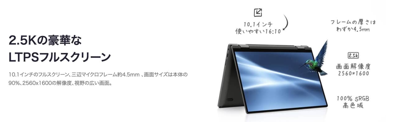 OneMix4のディスプレイは高解像度な2.5Kパネルを搭載!これまでのシリーズ同様にディスプレイは360度回転するのでタブレット形状でも利用可能!また、パネルはタッチに対応しているので直感的に操作ができるのもGood。