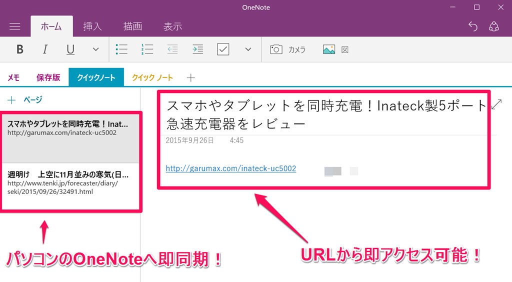 例えば出勤途中で気になったニュースなどをサクッと共有でOneNoteに残しておけば、お家に帰ってパソコン版のOneNoteから簡単にアクセスできるので、スマホとパソコン間の同期が超楽!というよりも何もしなくても勝手に同期してくれてます!