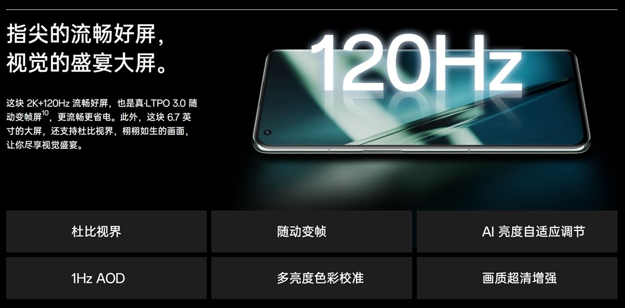 ▼有機ELディスプレイは6.7インチでエッジ形状。1Hz~120Hzの可変式リフレッシュレートに対応しているほか、解像度は3,216×1,440のWQHD+クラスと高いスペックになっています!↓