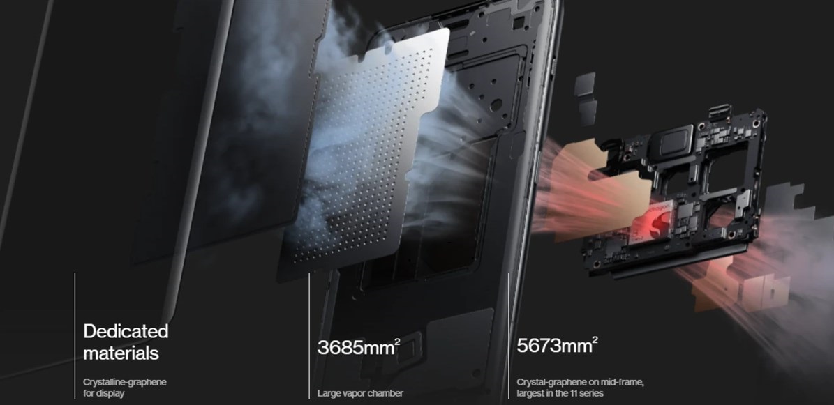 ▼ハイエンドたるもの処理性能が高い、ゆえに発熱は心配になるところですが、OnePlus 11は放熱を担うパネルを2層に分けて搭載しており対策しています。↓