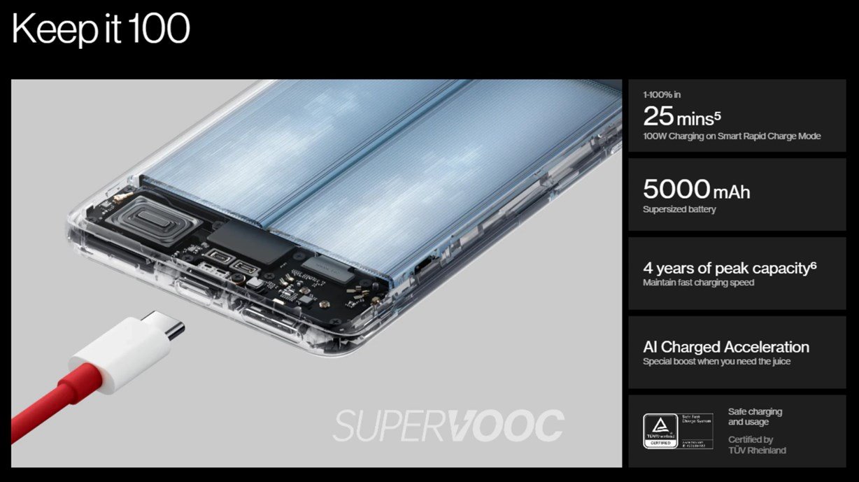 - 5,000mAhバッテリー搭載。最大充電100Wに対応