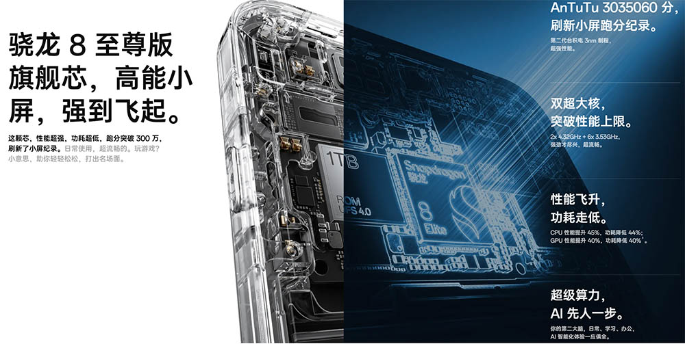 ▼SoCにはSnapdragon 8 Eliteを搭載、メモリは12/16GB。AnTuTuスコアの公称値は300万点。↓
