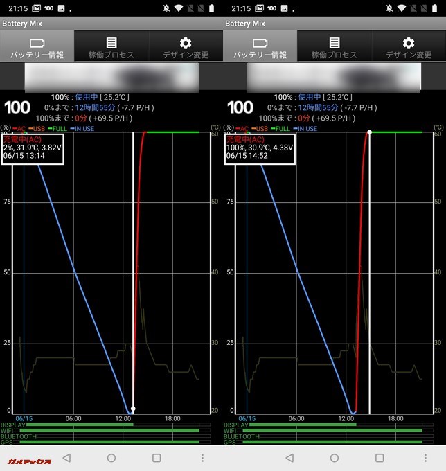 バッテリーの充電時間検証では、付属の充電器と充電ケーブルを利用してバッテリー残量0から満充電までの時間を測定しています。データ取得用のアプリは端末起動後にアプリを立ち上げるため、バッテリー残量は数%充電された状態からの測定となりますのでご了承下さい。