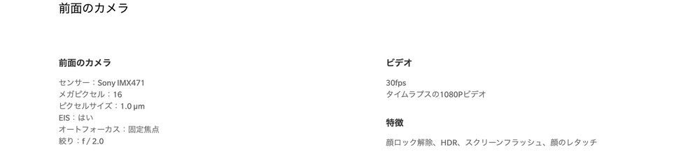 ▼セルフィーカメラの詳しい仕様は下図の通りです。↓