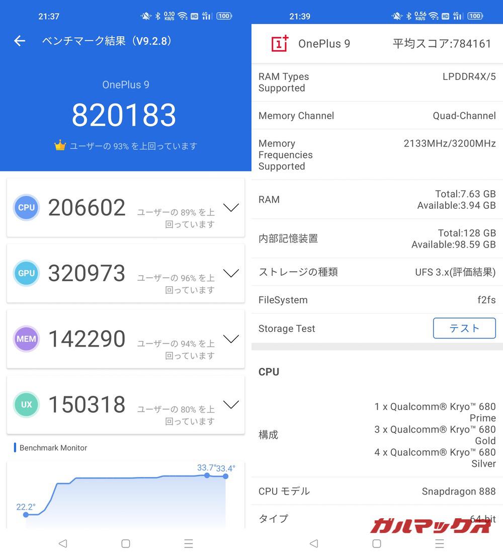 OnePlus 9(Android 12)のAnTuTuベンチマークスコア