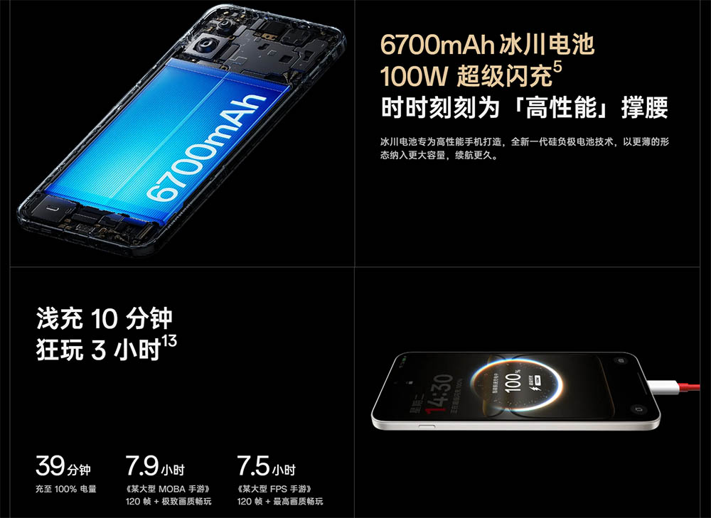 バッテリーは6700mAh。100W(SUPERVOOC)の急速充電対応で39分で満充電が可能。バッテリーではなく本体に直接給電するバイパス給電にも対応。ケーブル刺しっぱでゲームしてもバッテリーが傷みにくいです。