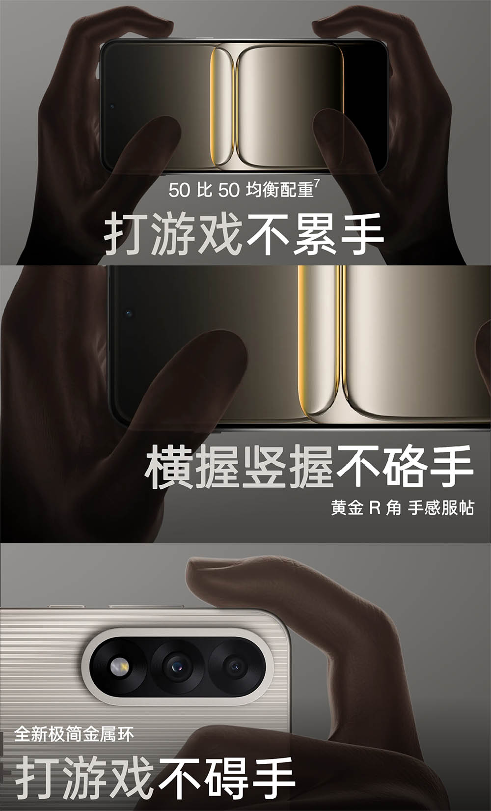 重量バランスが50:50と均等になっているため、長時間持っていても疲れにくいでしょう!そして、最近のOPPO、OnePlusの流行りである黄金R角という丸い角を採用。