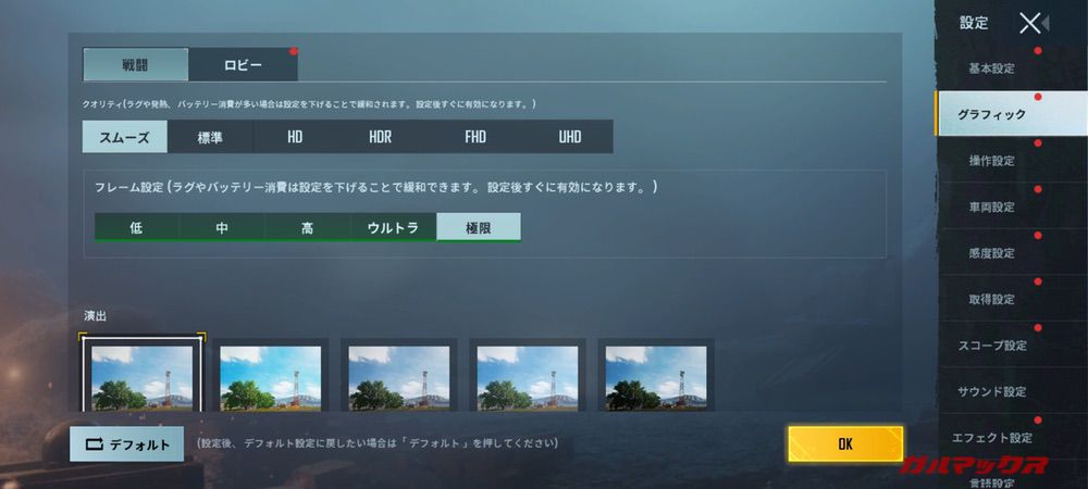 | PUBGモバイル グラフィック設定 フレームレート設定 |