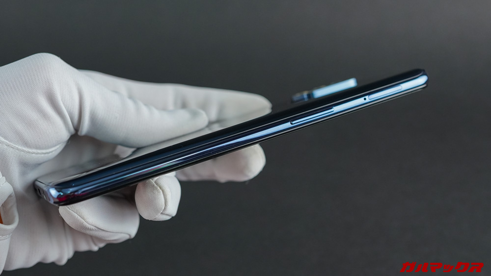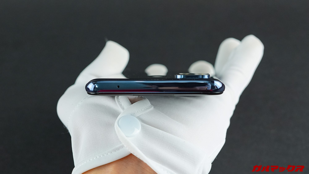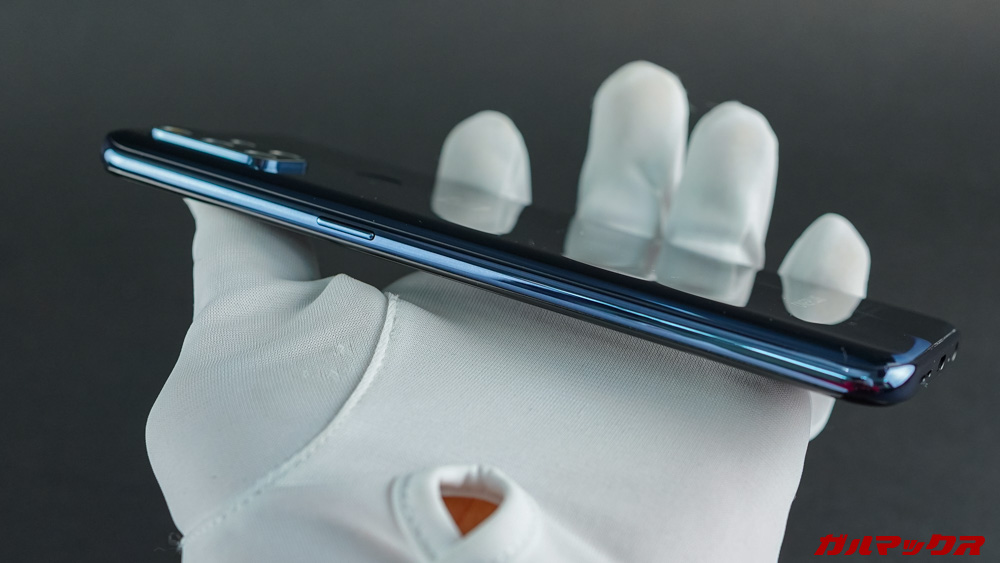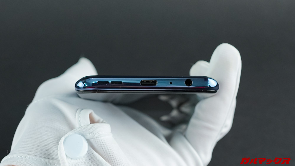 ▼画面から見て右側には電源キー、左側には音量キーとSIMスロット。下部にType-C充電端子とイヤホンジャックといった配置になっています。側面の質感は同じくツルツル。握った際のグリップが良く効きます。↓