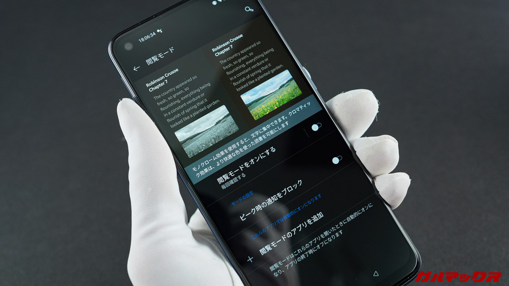 ▼また設定から色味の変更ができるほか、ダークモード、ブルーライトカットはもちろん読書に最適なモノクロ表示も出来るので、様々なシーンに対応できるのもGood。これ、純正OSにはない部分なのです。純正OSでも実装してくれんかなこれ。↓