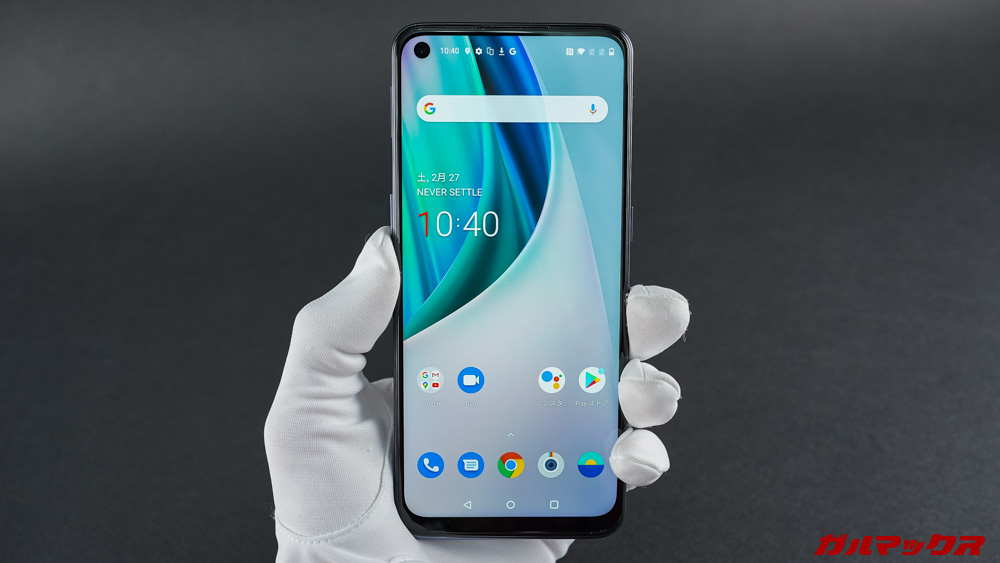 ▼OnePlus Nord N10のサイズはイマドキの大画面スマホらしい大きめサイズ。手が大きい筆者にとっては、OnePlus Nord N10のサイズ感は丁度よく感じます。手が小さい人だとちょっと厳しいかも、そんなサイズです。↓