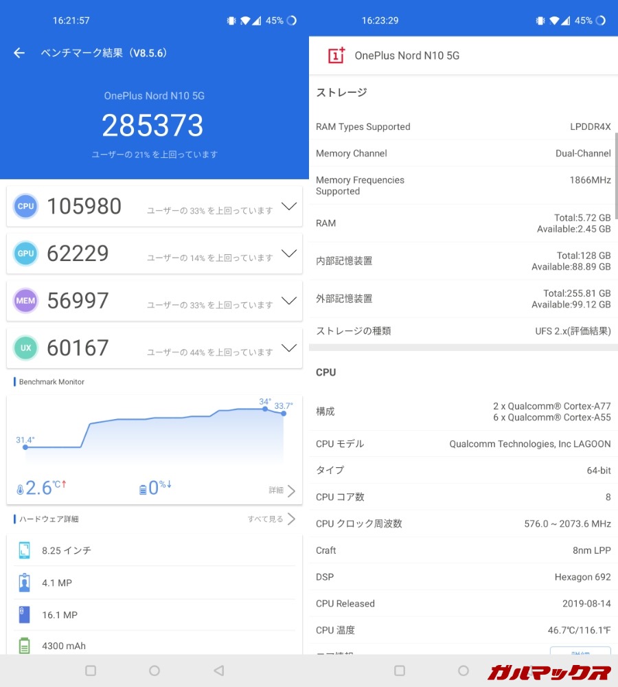 ▼OnePlus Nord N10の実機でAnTuTu(Ver8)を測定しました!総合スコアは285,373点、GPUスコアは62,229点です!↓