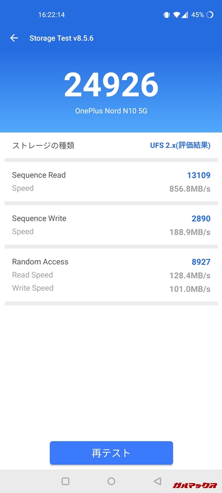 ▼ストレージ速度は読み込みが856.8MB/s、書き込みが188.9MB/sでした。↓