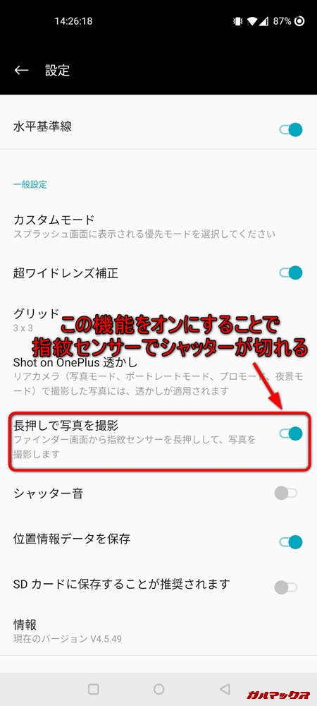 ▼さらに、カメラを使っている時に指紋センサーに長時間触れることでシャッターを切ることが出来るという面白い機能を搭載!押して1秒ほどでフォーカスをあわせて撮影するので、画面のシャッターを押すより安定しやすい!片手で持って撮影する時にとても重宝します。↓