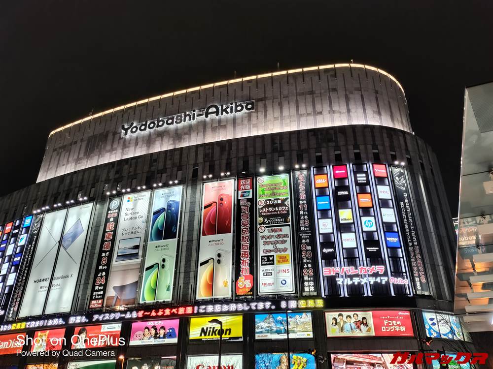 ▼夜景撮影性能も文句なし!iPhone 12 Pro Maxと比較すると看板部分の色の濃さに差はありますが、白飛びは抑えられており夜景を撮影するのに実用的な出来栄えっす。左がOnePlus Nord N10、右がiPhone 12 Pro Maxです。↓