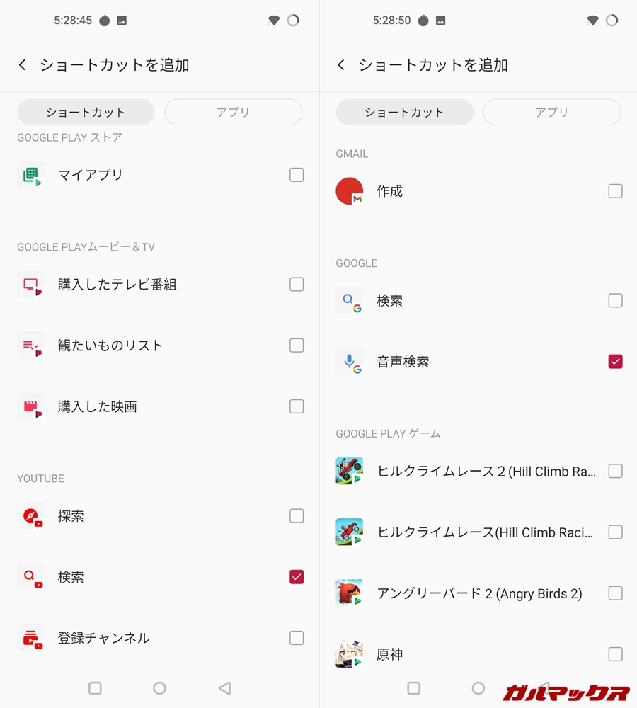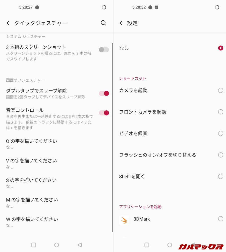 ▼有効にするには設定→ボタンとジェスチャー→クイックジェスチャーから機能の割り当てを行う必要があります。対応しているアルファベットはO、V、S、M、Wの5つ。認識した場合はバイブフィードバックとともに、割り当てられた動作を行うんス。↓