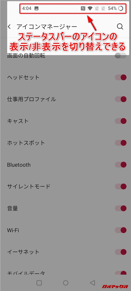 ちなみに純正OSでもこういったステータスアイコンの設定は出来るのですが、Activity Launcherなどのサードパーティ製アプリを通したりしないと設定が出来ない隠し要素みたいな仕様だったんですよね。