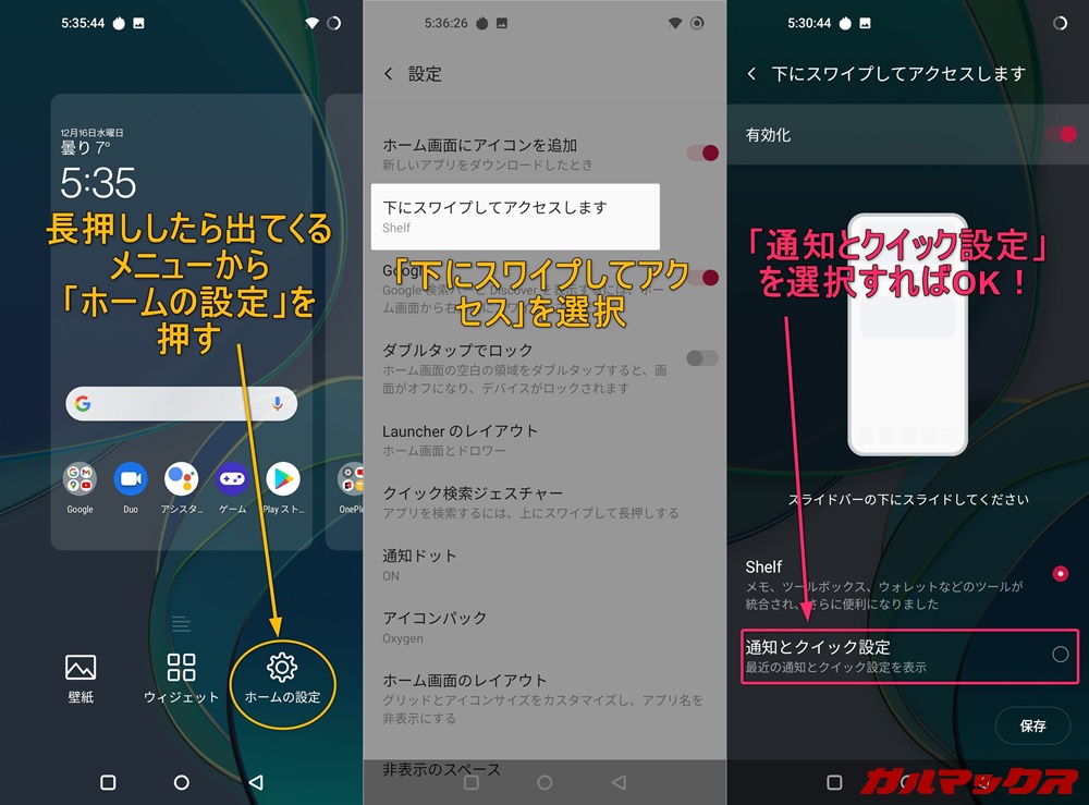 ▼もしShelfの動作で通知を開きたい場合「ホームの空白を長押し」→「ホームの設定」→「下にスワイプしてアクセス」の項目から、通知とクイック設定を選択しましょう。↓