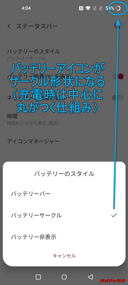 ▼バッテリーアイコンは、通常の電池形状に加えてサークル形状が追加されています。パーセンテージ表示でなくても割合がひと目で区別できるのが便利。また、充電時はサークル中心部に点が入ります。↓