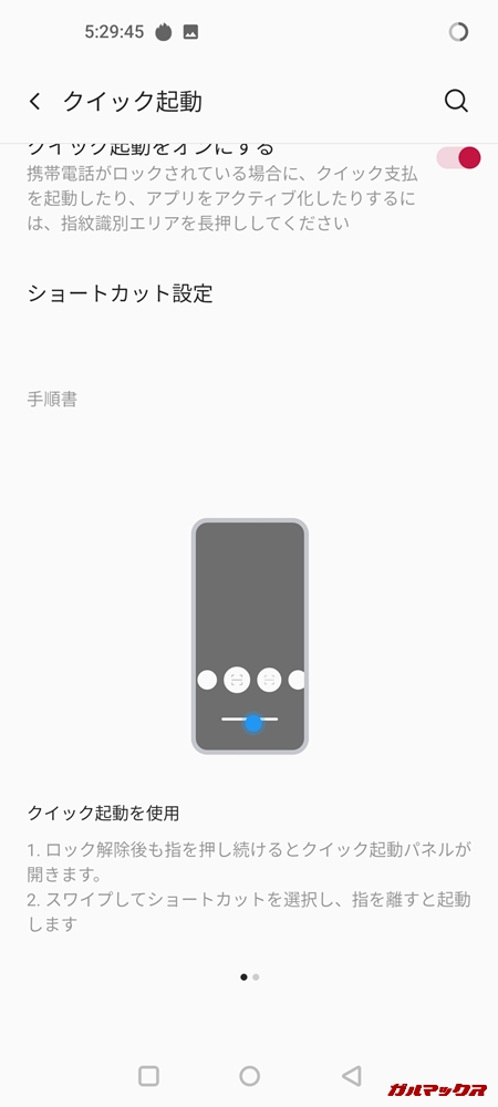 指紋センサーを押し続けることでクイック起動が使える