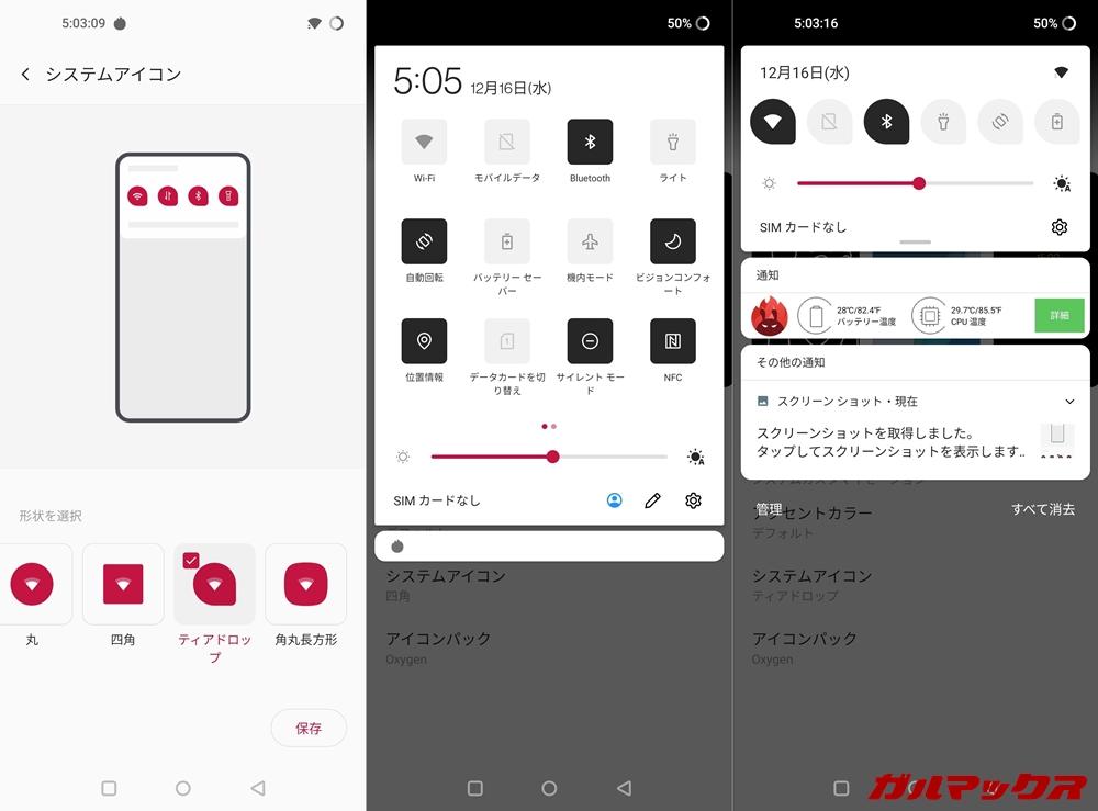 ▼また通知シェード内アイコンの形状を変更出来るのもOxygen OSのカスタマイズ性の高さを感じさせる部分。4種類の中から選択できます!↓