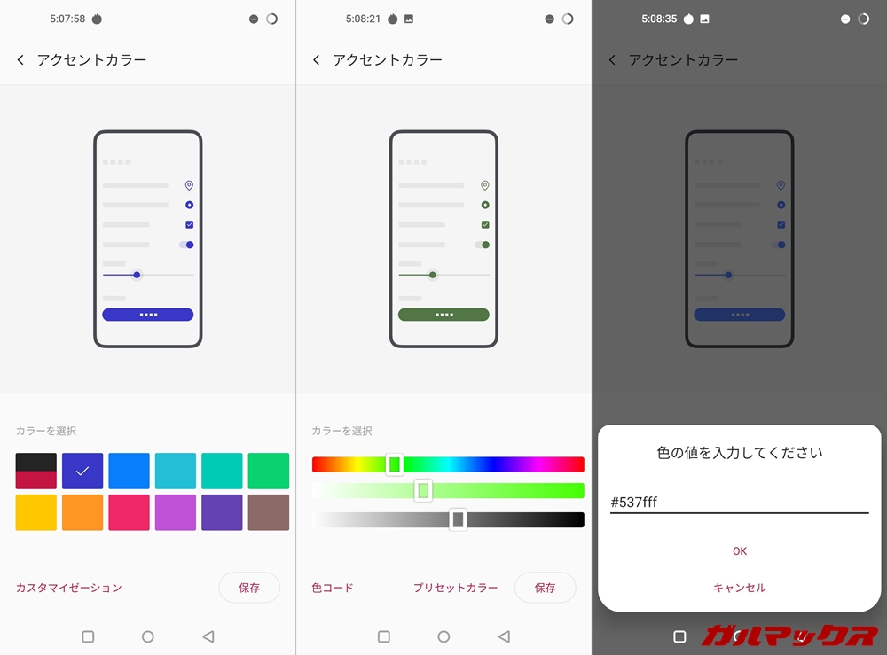 ▼そしてアクセントカラーを自由に変えられるのはOxygen OSの特権とも言えるべき機能。選択項目やボタンなどはカラーバー、カラーコードから指定できます。↓