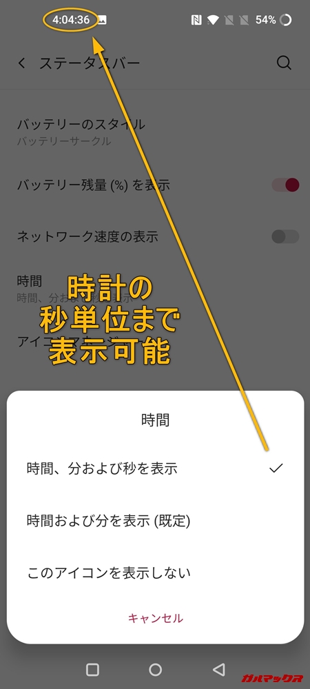 ▼次に通知バーのカスタマイズ。モバイルデータのピクトアンテナ、時計、Wi-Fiのアイコン等の表示/非表示ができるようになっています。上部のステータスバーをスッキリ!させたい人にオススメ。↓