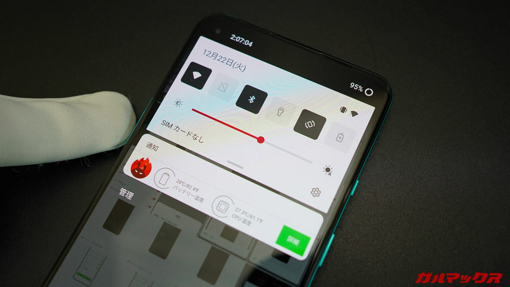 ▼上から下にスワイプして引き出す通知シェードはこんな感じ。純正OSと異なり「明るさ調節のバー」「設定マーク」が、下まで引き出さなくても出てくるようになっております!眩しいから明るさをすぐ変えたい時や、設定をいつでも開きたい場合にけっこう便利。↓