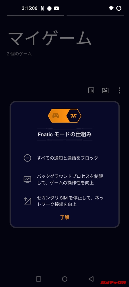 ▼さらにFnaticモードなる上位のゲームモードも搭載しているのが特徴。このFnaticモードは他アプリのメモリをゲームに割り当てることでより動作の安定性を高め、通知・着信もブロックしてくれます。ゲームごとの切り替えにも対応!↓