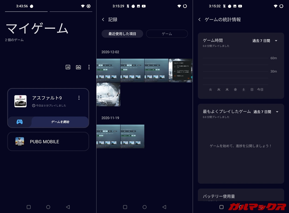 ▼Oxygen OSはゲームアプリをサポートするゲーミングモードを搭載。ゲームのみのスクショをまとめてくれたり統計をまとめてくれたりと便利。↓