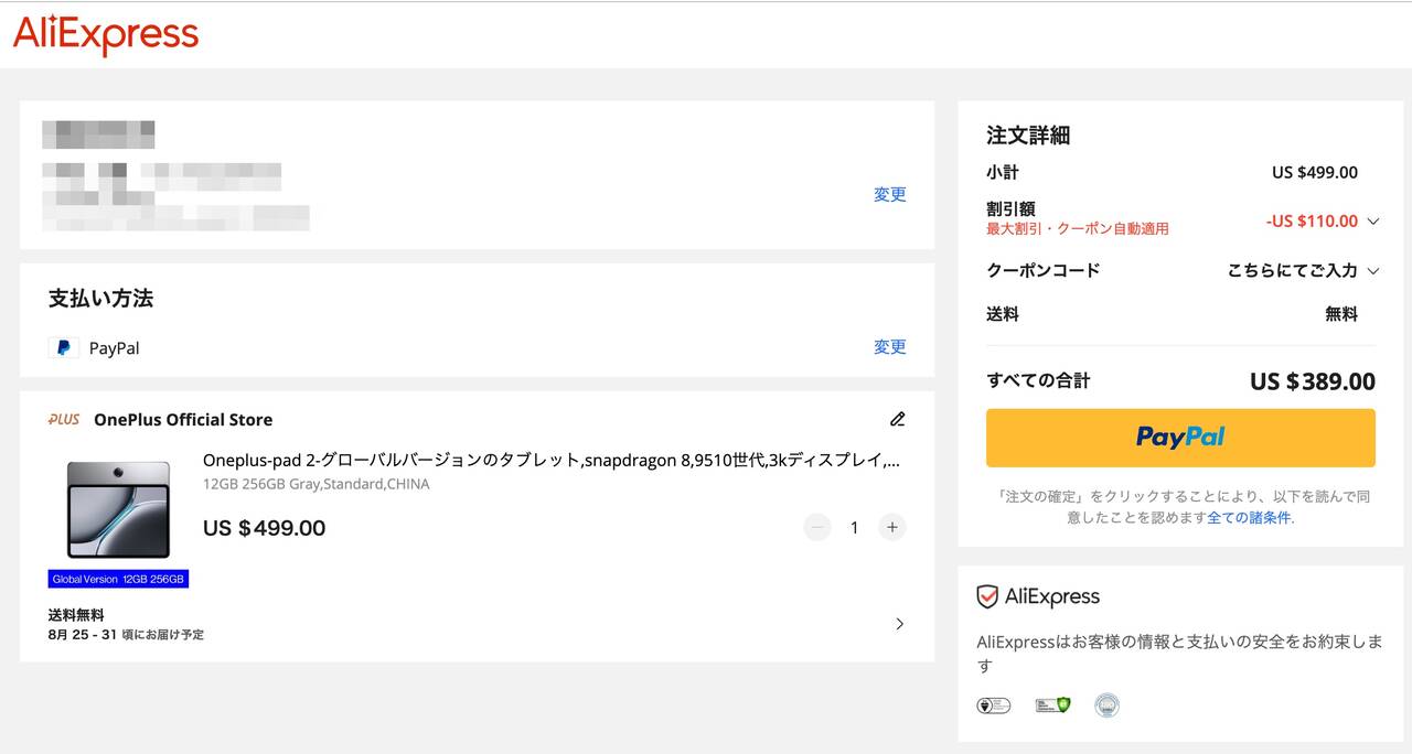 気になる価格は499.00ドル(約7.3万円)と中国版(12GB/256GB)の価格よりもすこ〜し安くなっていますが、今回のセールで発行されているクーポンコード「OPPAD2」と「BSAF80」を適用すると389ドル(約5.7万円)に!
